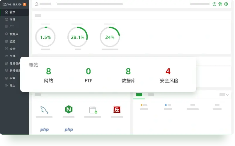 一键管理网站、数据库、FTP、文件、SSL、计划任务等